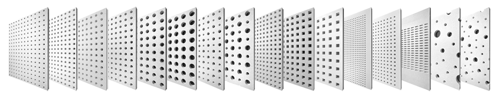 | Our high density perforated gypsum board comes in a variety of perforations and sizes to meet your architectural sound absorption goals. They consume large quantities of ambient sound energy creating significantly quieter and more comfortable atmospheres for any space where quiet listening or learning environments are critical. The gypsum board perforations also scrub airborne particles making cleaner air to breath. If you are looking for a soft surface sound absorption method, check out our sister companies SnapTex and PolySorb. CORPORATE • EDUCATION • HEALTHCARE • HOSPITALITY • RESTAURANT • RETAIL • HOUSES OF WORSHIP • RESIDENTIAL REQUEST SAMPLES OR A QUOTE FROM OUR TEAM